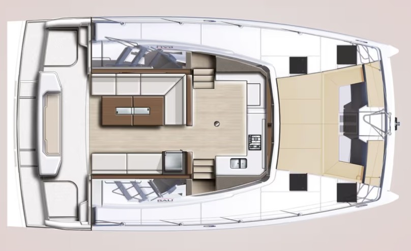 Head up to the flybridge and you'll find a spacious chill zone with plenty of room to unwind, plus a helm station that's a breeze to handle with a small crew, including a self-tacking foresail. It's all about smooth sailing and good vibes.