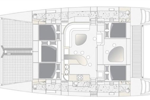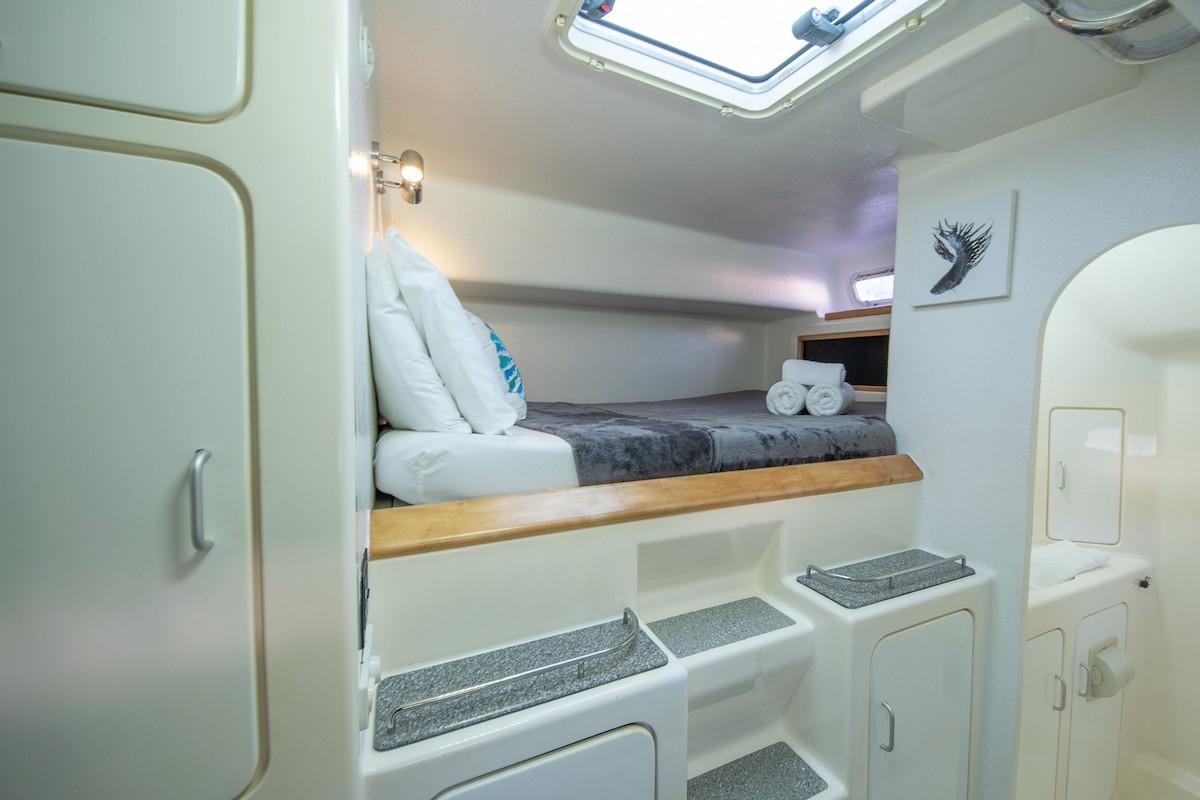 There are 4 queen cabins, each with an ensuite and electric head. There is also a 5th cabin for the crew, forward of the salon, with access via the deck hatch. It's also a queen, including a fan, AC, storage locker, cabin, and reading lights. The crew's head is located in the port hallway.